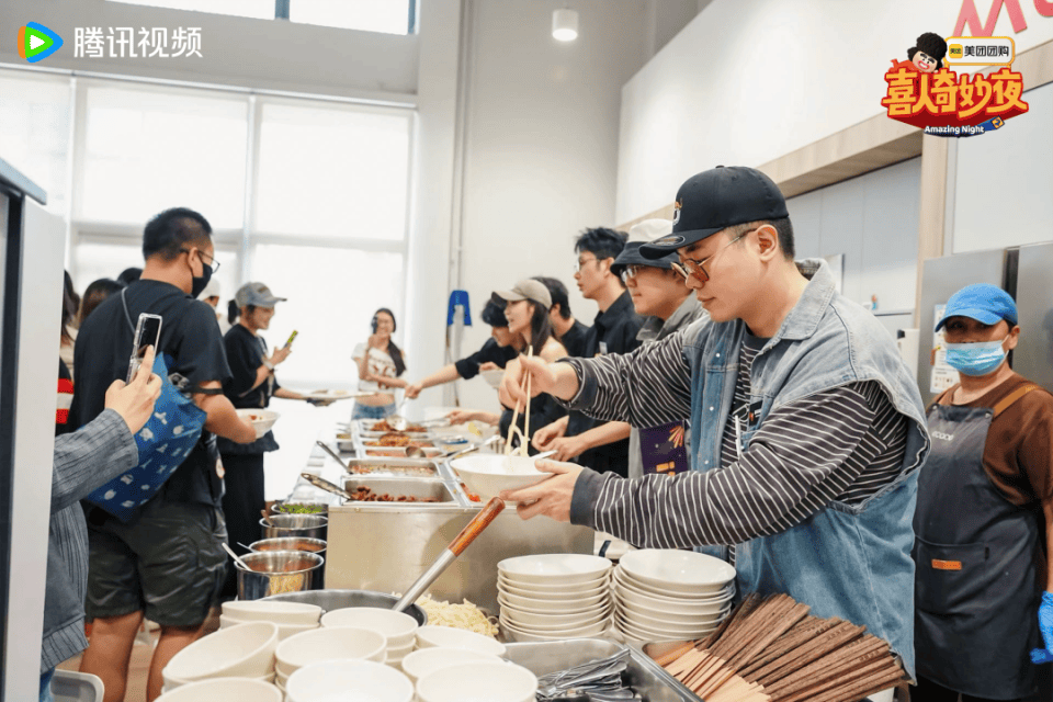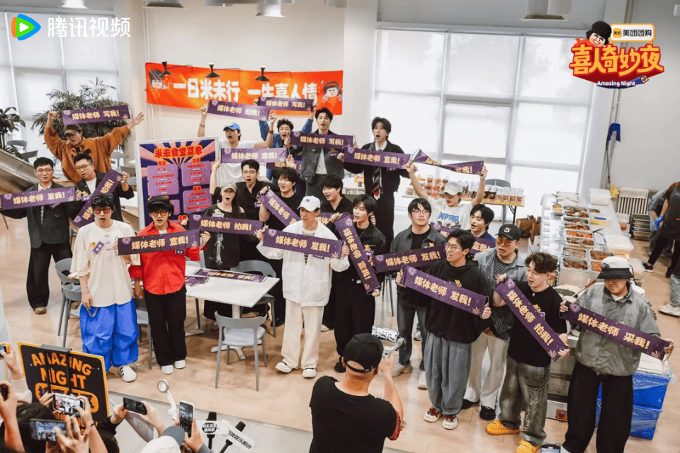 群访环节后,媒体来到米未公司进行扫楼打卡和喜人现场营业“撒饭”。《喜人奇妙夜》作为首个获得白玉兰最佳综艺奖的纯网播综艺,活动将白玉兰奖杯与团长奖杯设置为“接喜气区”,由高海宝、泰维带领大家一起“接好运”;蒋龙、张弛的吉他弹唱区更令人梦回逐梦亚军的经典名场面;某某某以书法形式为大家送上中秋祝福;同时,张呈、雷淞然通过油菜花变装合拍回应玩梗;蒋易、孙天宇的高歌猛唱区,以及多位喜人上阵的食堂“撒饭”服务,让所有到场来宾都沉浸式打卡“喜人宇宙”。